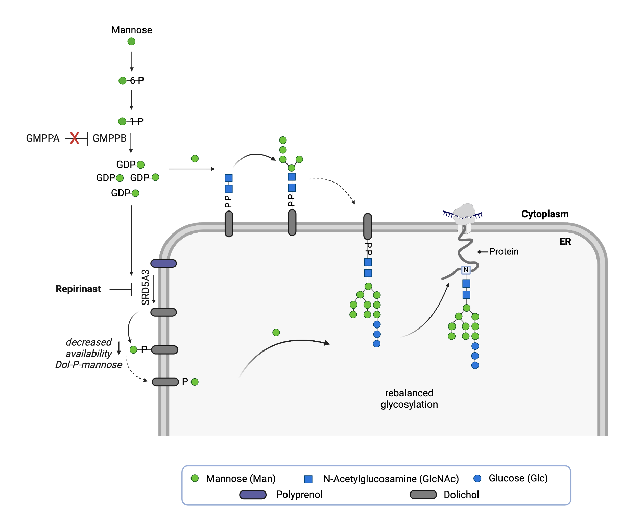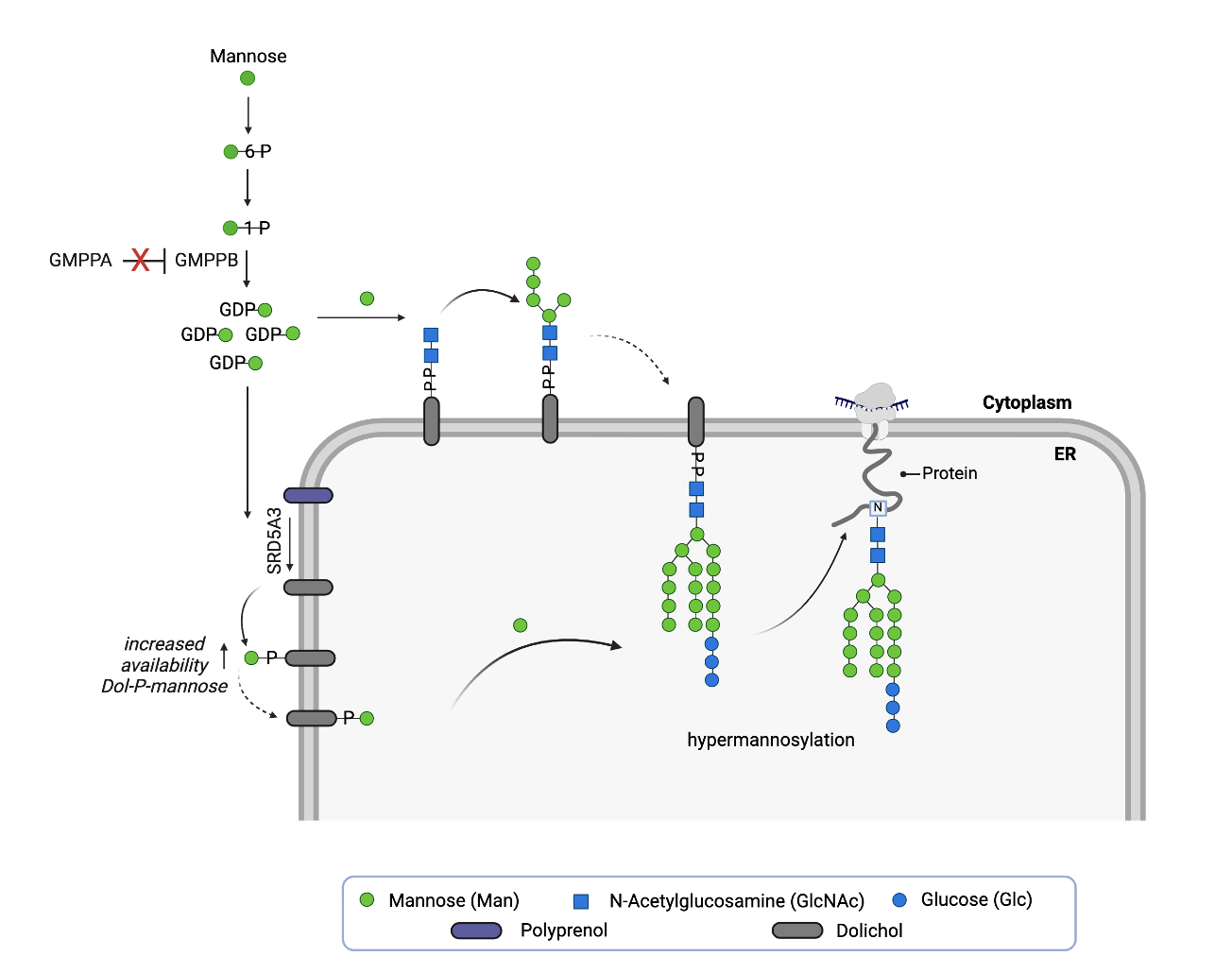 GMPPA has a dancer partner called GMPPB, so the pathomechanism is more intricate. Loss-of-function mutations in the GMPPA gene leads to overactive GMPPB protein activity. In other words, the loss of GMPPA function leads to a gain of GMMPB function, ultimately resulting in excess glycosylation, specifically hypermannosylation. Normally in CDG, the disease driver is insufficient glycosylation, or hypoglycosylation. But in the case of GMPPA-CDG, too little of something but also too much of something — in this case GDP-mannose precursor — can be a bad thing according to the still inscrutable wiles of the wire diagram of metabolism.