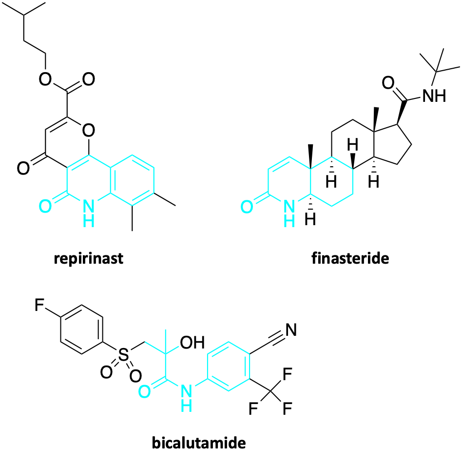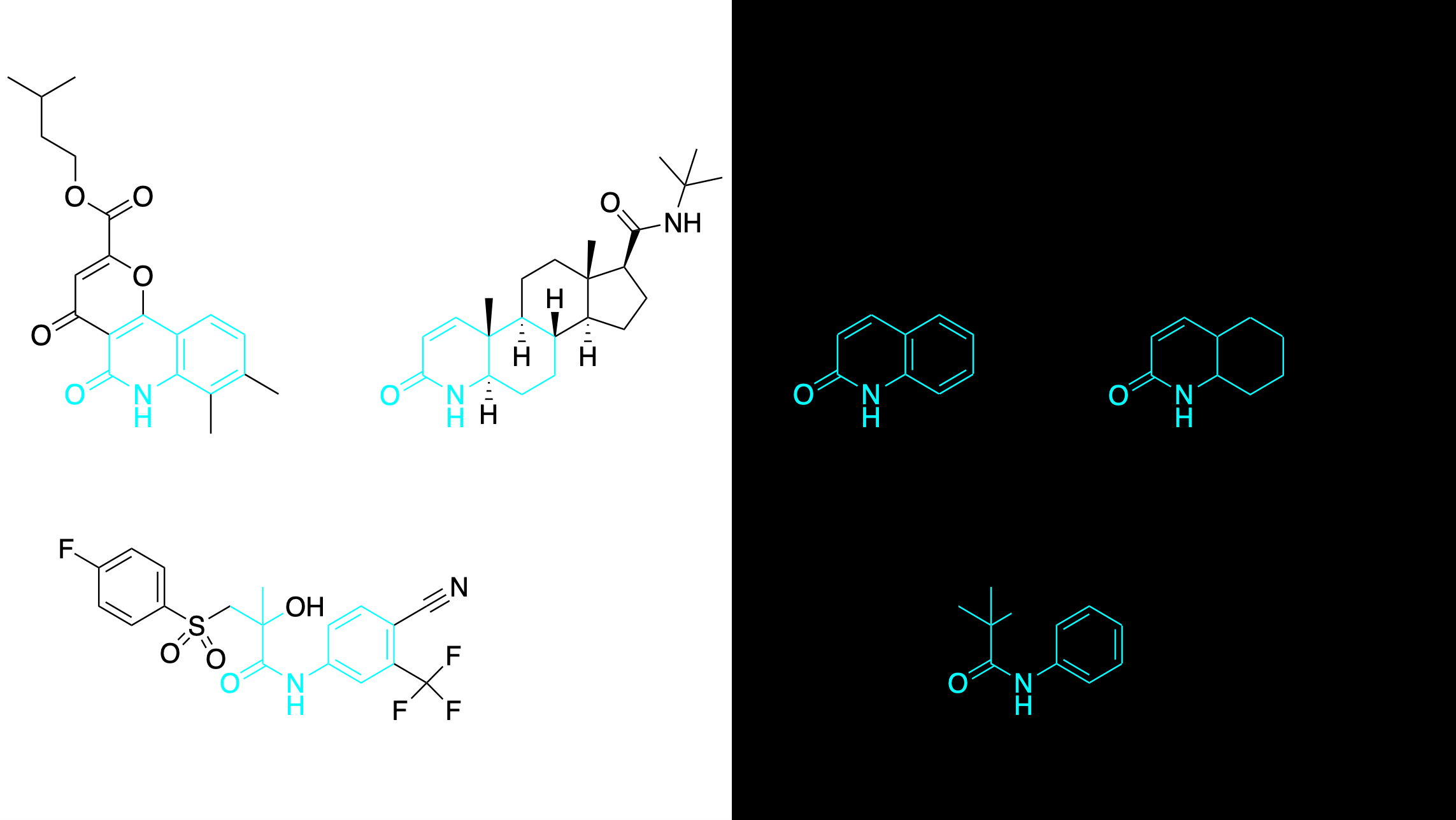 With the proper lens to refract the data, a clear mechanistic hypothesis emerges from the three hit structures in isolation, denoting a conserved structure-activity relationship, or what we refer to as the SRD5A3 active site pharmacophore, which is depicted below in cyan. Independent of chemical structure, the known shared pharmacology of the steroidal antiandrogen finasteride and the nonsteroidal antiandrogen bicalutamide further corroborates the prediction: repirinast is a cryptic SRD5A3 inhibitor.