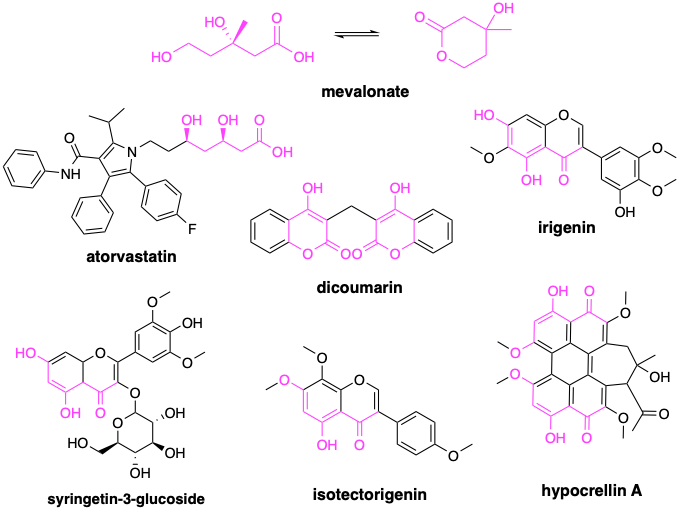 The SRD5A3 pharmacophore is observed in both the closed conformation, as with repirinast and finasteride, as well as in the open conformation of bicalutamide. That’s another pattern we’ve seen before: cyclic versus linear versions of the same pharmacophore. Coincidentally, it just so happens that we observed that same pattern in the worm-powered screen for SRD5A3-CDG, where the mevalonate pharmacophore (in purple) reveals itself, or a fragment thereof, in both linear and cyclic forms in the top hits from the screen.