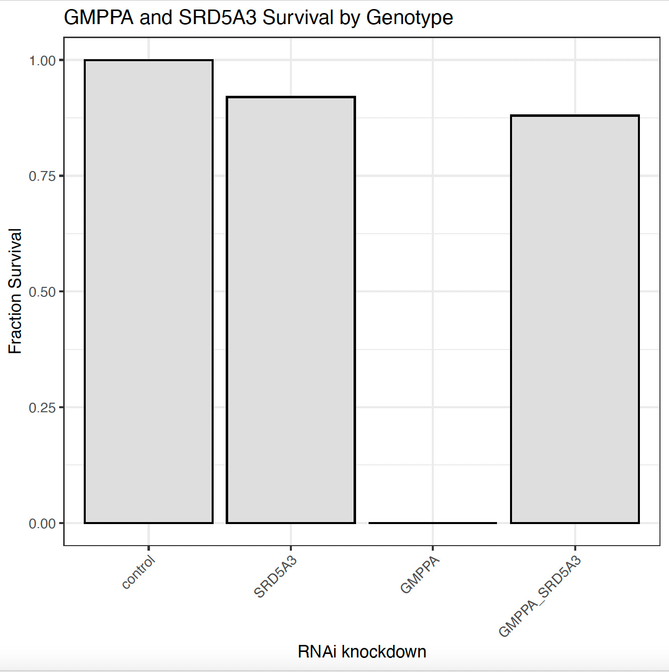 In the absence of molecular target data, the GMPPA-CDG fly model provides the most compelling evidence that repirinast is a cryptic SRD5A3 inhibitor. Knockdown of SRD5A3 alone is not lethal, but knockdown of GMPPA alone is. However, knockdown of both GMPPA and SRD5A3 results in near complete rescue of lethality. Fly genetics confirms the pharmacology and a “two wrongs make a right” mechanism.
